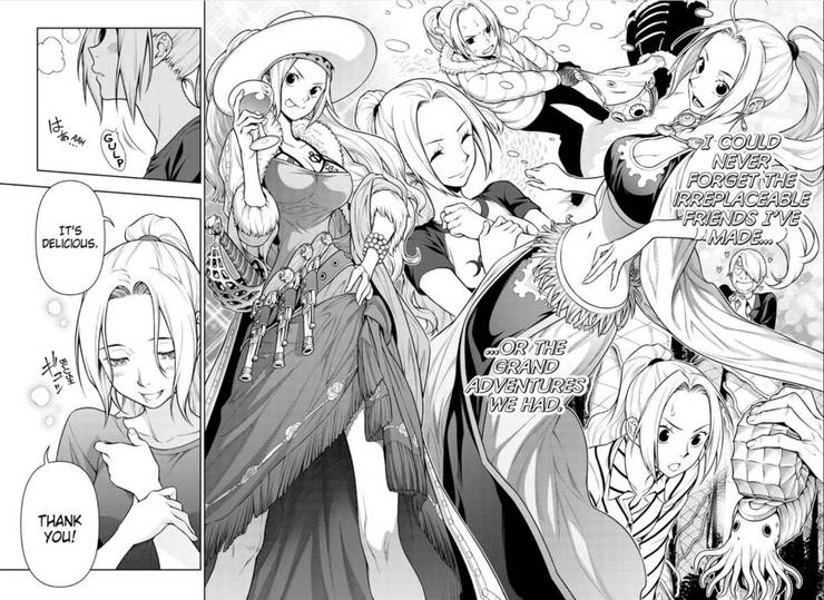 As Luffy rapidly scarfs down food Sanji interacts with Nefertari Vivi and gets the idea to go to the kitchen and make a special dessert for her and Nami. By Lee Russo Published Jul 23 2021. The following contains spoilers for Chapter 3 of Shokugeki no Sanji by Yuto Tsukuda Shun Saeki Yuki Morisaki Adrienne Beck and Annaliese Ace Christman available in English now from Viz Media.